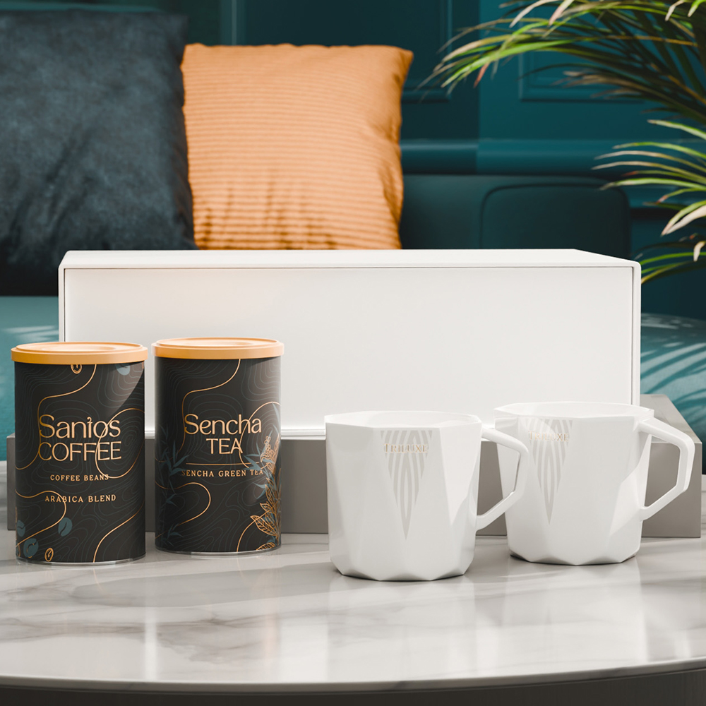 Luksusowy zestaw oparty na cienkościennych kubkach Crown (Fine Bone China), to manifest prestiżu. W środku również wyselekcjonowana kawa "Santos Coffee" i herbata "Sencha Tea" w eleganckich puszkach. Całość pakowana w ekskluzywne, śnieżnobiałe opakowanie zamykane na magnes.